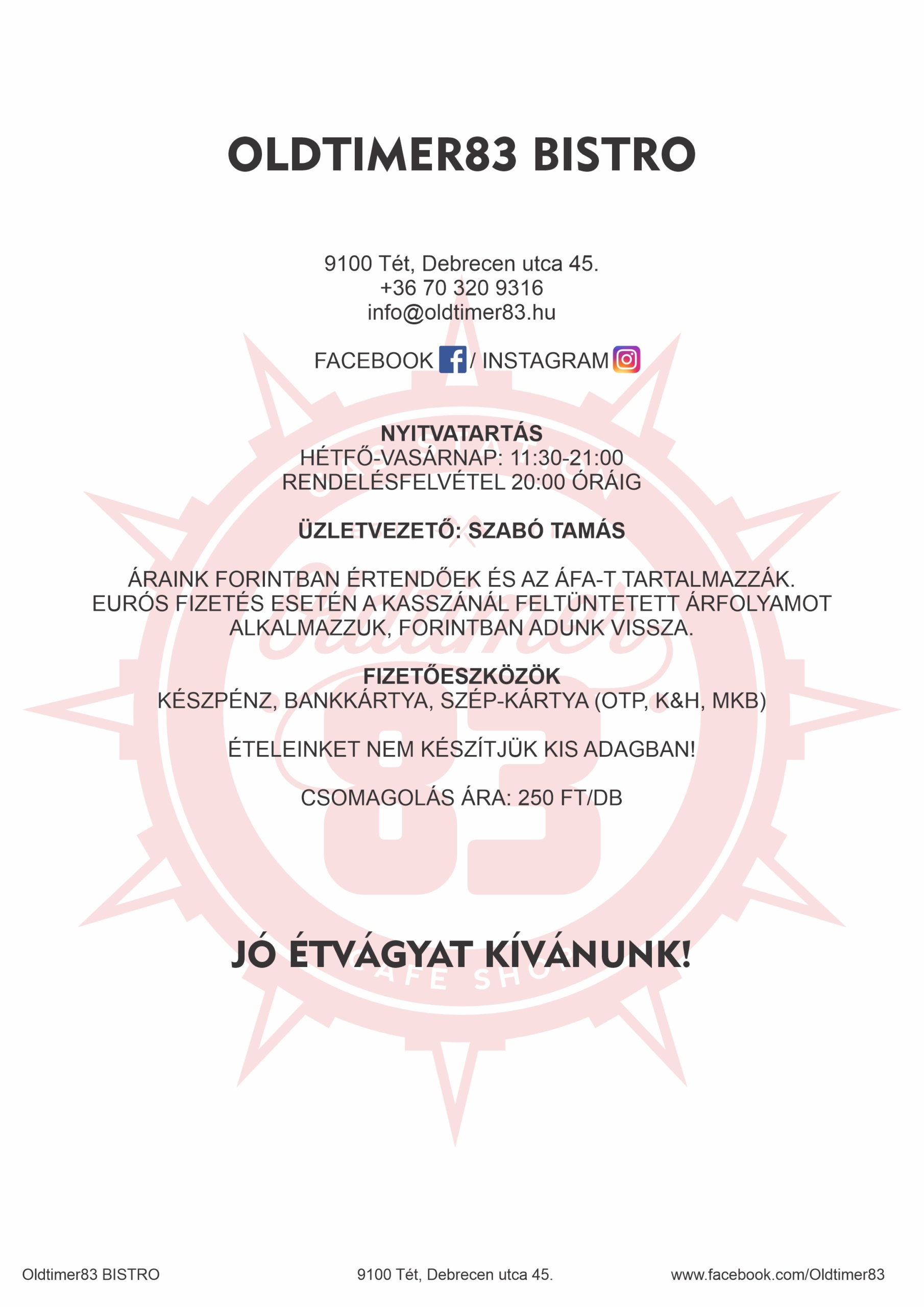 2023 tavaszán megnyitottuk új éttermünket az Oldtimer83 épületében.